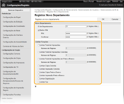 Registre uma ID de Departamento e defina um PIN para ela. Registre todas as IDs de departamento a serem utilizadas.