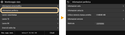 È possibile modificare diverse impostazioni relative alla visualizzazione, come la lingua: <Impostazioni visualizzazione> È possibile cambiare la schermata visualizzata automaticamente quando la macchina non viene utilizzata per uno specificato intervallo di tempo: <Funzione dopo ripristino automatico> È possibile apportare modifiche a varie impostazioni legate all'operatività, come la luminosità dello schermo: <Accessibilità> |