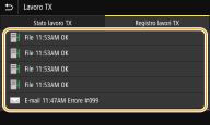 Per controllare i registri dei documenti inviati1 | Selezionare il documento di cui si desidera verificare il registro nella scheda <Registro lavori TX>. <OK> viene visualizzato quando un documento è stato inviato correttamente e <Errore> viene visualizzato quando un documento non viene inviato perché è stato cancellato o si è verificato un errore. ![]() Vengono visualizzate informazioni dettagliate relative al documento. ![]() Quando viene visualizzato un numero a tre cifre in caso di <Errore> Questo numero rappresenta un codice di errore. Per ulteriori informazioni, consultare "Risoluzione dei problemi (FAQ)" sul sito web dei manuali online. Registrazione della destinazione del documento inviato nella Rubrica Per un documento inviato in una destinazione non registrata nella Rubrica, è possibile registrare tale destinazione in Rubrica selezionando <Regis. in rubrica> nella schermata dei dettagli. |