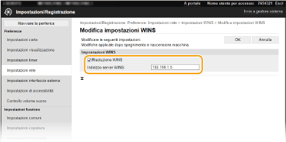 Per specificare le impostazioni del server WINS, è necessario impostare [Impostazioni nome computer/nome gruppo di lavoro]. Configurazione del nome computer e del nome del gruppo di lavoro Se si deseleziona la casella di controllo [Utilizzo NetBIOS] in [Impostazioni nome computer/nome gruppo di lavoro], l’impostazione WINS viene disabilitata. Assicurarsi di selezionare la casella di controllo [Utilizzo NetBIOS] quando si utilizza WINS. La funzione non è disponibile in una rete IPv6. |