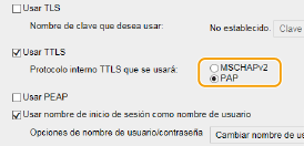 1 | Seleccione la casilla de verificación [Usar TTLS] o [Usar PEAP]. Protocolo interno para TTLS Puede seleccionar MSCHAPv2 o PAP. |