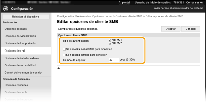 Si marca la casilla de verificación [Se necesita cifrado para conexión], el equipo solo podrá conectarse a servidores SMB compatibles con la comunicación cifrada SMB v3.0. Si se marcan las casillas de verificación [1.0] y [2.0] de [Versiones del cliente SMB especificadas] pero no se marca [3.0], el equipo no podrá conectarse a servidores SMB no compatibles con la comunicación cifrada SMB v3.0. Utilice la misma versión de SMB con el servidor SMB y el cliente SMB. No es posible usar SMB si las versiones son distintas. |