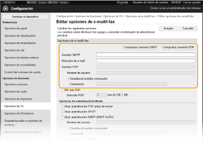 Utilice la IU remota para configurar las opciones detalladas de envío y recepción, como pueden ser las opciones para utilizar el equipo para enviar y recibir I-Faxes y las opciones para la autenticación POP y el cifrado de la comunicación antes de enviar e-mails o I-Faxes. Póngase en contacto con su proveedor o administrador de red para obtener la configuración necesaria.