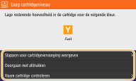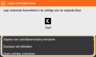 Dit bericht betekent dat de tonercartridge met de aangegeven kleur binnenkort moet worden vervangen. Zorg dat u beschikt over een nieuwe tonercartridge. Vervang de tonercartridge als u dit bericht ziet net voordat u een grote taak wilt gaan afdrukken. Dit verschijnt als <Actie bij waarschuwing> is ingesteld op <Afdrukken stoppen> (