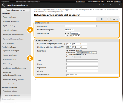 U kunt een sleutel en certificaat genereren met het apparaat als dit nodig is voor gecodeerde communicatie via Transport Layer Security (TLS). U kunt TLS gebruiken voor toegang tot het apparaat via de externe UI. Zelf-ondertekende certificaten worden gebruikt bij de sleutel en certificaat die zijn gegenereerd in 'Netwerkcommunicatie'.
