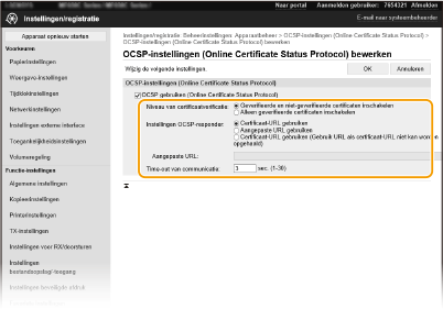 U kunt verifiëren of het certificaat dat u tijdens de communicatie van de andere partij hebt ontvangen geldig is door een verzoek te zenden naar de OCSP (online certificate status protocol) responder (een server die OCSP ondersteunt). Kies het verificatieniveau van het certificaat en de OCSP-responder waarmee u verbinding wilt maken. De beheerder moet deze registreren.