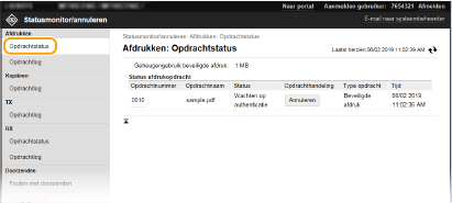 Ongeacht de instelling van Afdeling-ID beheer, bevat de lijst alle afdruktaken die worden afgedrukt en die wachten op afdrukken. Als u een gebruikersnaam hebt ingevoerd tijdens het inloggen in de Algemene Gebruikersstand, wordt uw gebruikersnaam alleen weergegeven op de documenten die u hebt afgedrukt. Klik op [Opdrachtnummer] op de gepauzeerde documenten en de beveiligde documenten om gedetailleerde informatie weer te geven. U kunt de gebruikersnaam en de paginatelling van het afgedrukte document controleren. |