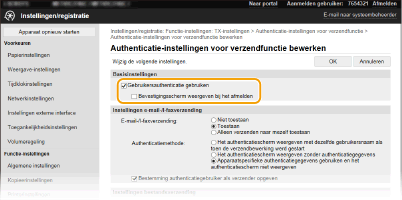 [Apparaatspecifieke authenticatiegegevens gebruiken en het authenticatiescherm niet weergeven] | Er wordt geen authenticatiescherm weergegeven wanneer e-mail of een I-Fax wordt verzonden. Autorisatie wordt op de SMTP-server uitgevoerd met de gebruikersnaam en het wachtwoord die zijn ingesteld in [E-mail-/I-faxinstellingen] Communicatie-instellingen voor E-mail/I-Fax configureren. |