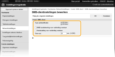Geef de instellingen op die moeten worden gebruikt als het apparaat verbinding maakt met een netwerk als een SMB-client.