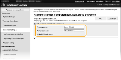 Een werkgroepnaam is een naam om meerdere computers te groeperen, zodat deze in een Windows-netwerk de beschikking krijgen over eenvoudige netwerkfuncties, zoals bestandsdeling. Gebruik alfanumerieke tekens bij het opgeven van de naam van de werkgroep waarvan het apparaat deel uitmaakt.