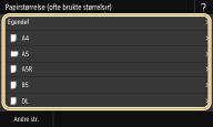 Hvis skjermbildet vist over ikke vises når papir er lagt innHvis du alltid legger i samme papir i åpningen for manuell mating, kan du hoppe over innstilling av papir ved å registrere papirformatet og -typen som standardinnstillingen. Når standardinnstillingen er registrert, vises derimot ikke skjermbildet vist over. Hvis du vil vise skjermbildet, velger du <Angi når papir lastes> (Registrere standard papirinnstillinger for åpningen for manuell mating). |