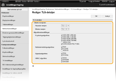 Bruke betjeningspaneletDu kan også aktivere eller deaktivere TLS-kryptert kommunikasjon fra <Meny> på Hjem-skjermen. <Fjernkontroll> Starte Fjernkontroll med TLSHvis du prøver å starte Fjernkontroll når TLS er aktivert, kan det hende at det vises et sikkerhetsvarsel om sikkerhetssertifikatet. Hvis dette er tilfelle, må du kontrollere at riktig URL-adresse er angitt i adressefeltet, og deretter fortsette med å vise Fjernkontroll-skjermbildet. Starte grensesnittet for Fjernkontroll Bruke TLS til å kryptere kommunikasjon ved bruk av e-post/I-faksHvis SMTP-serveren og POP3-serveren støtter TLS, kan du aktivere TLS for kommunikasjon med disse serverne (Konfigurere kommunikasjonsinnstillinger for e-post/I-faks). Hvis du vil ha mer informasjon om SMTP-serveren og POP3-serveren, kontakter du Internett-leverandøren eller nettverksadministratoren. |