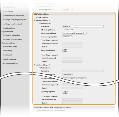 Med SNMPv3 kan du implementere behandling av nettverksenheter som er beskyttet av robuste sikkerhetsfunksjoner. Legg merke til at TLS må være aktivert for Fjernkontroll før du konfigurerer SNMPv3 (Konfigurere nøkkel og sertifikat for TLS).
