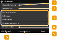 När du väljer <Statusmonitor> visas en skärm där du kan kontrollera förloppet hos dokument samt status för enheten och information om nätverksinställningar.