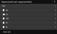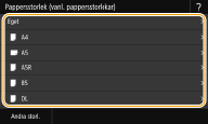 Om ovanstående skärm inte visas när papper fylls påOm du alltid fyller på samma papper i facket för manuell matning kan du hoppa över pappersinställningarna genom att registrera pappersformatet och papperstypen som standardinställningar. När standardinställningarna har registrerats visas emellertid inte ovanstående skärm. Om du vill visa skärmen väljer du <Ange när du matar in papper> (Registrera standardpappersinställningar för facket för manuell matning). |