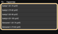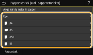 När du har registrerat standardpappersinställningar visas inställningsskärmen inte när du fyller på papper och samma inställningar används varje gång. Om du fyller på andra pappersformat eller papperstyper utan att ändra pappersinställningar blir utskrifterna kanske inte bra. För att undvika detta problem väljer du <Ange när du matar in papper> i steg 3 och fyller därefter på papper. |
