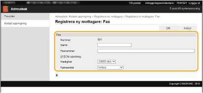 Du kan även ange [ECM-sändning] och [Hastighet] från <Faxinställningar> ( <Sänd>) på kontrollpanelen. Inställningar gjorda från <Adressbok> är dessutom aktiverade för de detaljerade inställningarna för mottagare som registrerats i adressboken. |