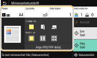 Skärmen HemOm <Skärm vid ansl. minnesenhet> har angetts till <På> visas funktionsskärmen för medieanslutning när du sätter i ett USB-minne medan Hem-skärmen visas. Om du väljer <Minnesenhetsutskrift> visas skärmen Utskrift från minne.