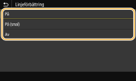 <Linjeförbättring> Ange om du vill använda rutinen för att standardisera tjockleken på tunna linjer. <På> Standardisera tjockleken på tunna linjer. <På (smal)> Standardiserar och minskar tjockleken på tunna linjer. Linjerna kan bli för tunna och/eller otydliga. <Av> Standardiserar inte tjockleken på tunna linjer. Beroende på ritningens position och linjens vinkel kan tunna linjer skrivas ut tjockare eller ojämnt. |