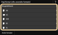 Hvis den skærm, der er angivet herover, ikke vises, når der er ilagt papirHvis du altid ilægger det samme papir i den manuelle fremføringsåbning, kan du springe betjeningen af papirindstillingerne over ved at registrere papirformatet og papirtypen som standardindstillingen. Når standardindstillingen er blevet registreret, vil den skærm, der er angivet herover, imidlertid ikke blive vist. Hvis du vil vise skærmen, skal du vælge <Angiv ved ilægning af papir> (Registrering af standardpapirindstillinger for den manuelle fremføringsåbning). |