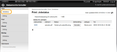 Uanset indstillingen for styring af afdelings-id'er vises alle dokumenter til udskrivning, der i øjeblikket udskrives eller venter på at blive udskrevet. Hvis du indtastede dit brugernavn, da du loggede på som almindelig bruger, vises dit brugernavn kun på de dokumenter, som du udskrev. Klik på [Jobnummer] på de midlertidigt afbrudte dokumenter, og sikr dokumenter for at vise detaljerede oplysninger. Du kan kontrollere brugernavnet og sideoptællingen for det udskrevne dokument. |