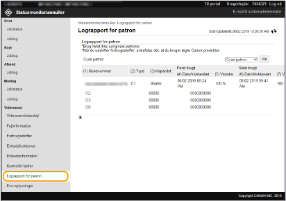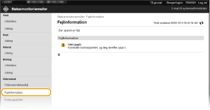 For at arbejde med dokumenter, der ikke kunne videresendes, skal du konfigurere følgende indstillinger: Indstil <Brug hukommelseslås> til <Til>. Indstil <Brug faxeksempel> til <Til>. Log på Fjern-UI i systemadministratortilstand. Du kan klikke på [Slet] for at slette dokumenter, der ikke kunne videresendes. Du kan klikke på [Jobnummer] for at få vist detaljerede oplysninger eller en forhåndsvisning af det dokument, der ikke kunne videresendes. Du kan også udskrive/sende igen/slette dokumenter, der ikke kunne videresendes ved hjælp af maskinens kontrolpanel. |