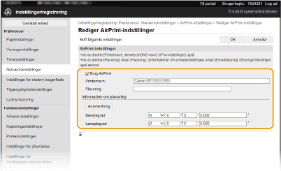 Gør det muligt for dig at kontrollere de værdier, der er indtastet i AirPrint-indstillingerne, som f.eks. maskinens navn og lokation. Du kan klikke på [Rediger] for at ændre indstillingerne.