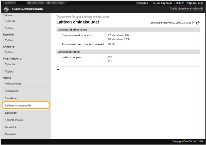 Osastotunnusten hallinnan asetuksista riippumatta kaikki parhaillaan tulostettavat tai tulostusta odottavat asiakirjat luetellaan. Jos syötit käyttäjänimesi, kun kirjauduit sisään yleiskäyttäjätilassa, käyttäjänimesi näytetään vain itse tulostamissasi asiakirjoissa. Valitse pysäytetyn asiakirjan tai turvatulostusasiakirjan [Työnumero], jos haluat nähdä tarkat tiedot. Voit tarkistaa tulostetun asiakirjan käyttäjänimen ja sivumäärän. |