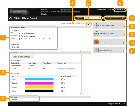 Näyttää laitteen nykyisen tilan ja virhetiedot. Jos on tapahtunut virhe, näytetään linkki virhetietosivulle.