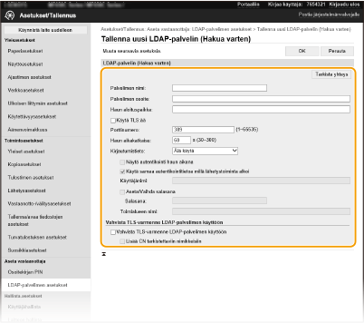 LDAP-palvelimen rekisteröinti täytyy suorittaa erikseen joko hakua tai todennusta varten. Jos haluat käyttää LDAP-palvelinta faksien ja sähköpostin vastaanottajien hakemiseen, rekisteröi se hakua varten. Jos haluat käyttää sitä sähköpostien ja faksien todennukseen, rekisteröi se todennusta varten.