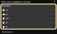 Kui paberi asetamisel seda kuva ei kuvataKui asetate käsitsisööduavasse alati sama paberi, siis saate paberi määramise toimingud vahele jätta, salvestades paberiformaadi ja -tüübi vaikeseadetena. Kui vaikesätted on salvestatud, siis ei kuvata ülaltoodud kuva. Kuva kuvamiseks valige <Määram. paberi laadimisel> (Käsitsisööduavas kasutatava paberi vaikesätete salvestamine). |
