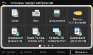 Для упрощения применения кнопок можно изменить их расположение по своему усмотрению. Например, можно поместить наиболее часто используемые кнопки в начало или же разместить кнопки вызова функций вместе с кнопками быстрого вызова любимых настроек. Вместо кнопки можно также вставить пустую ячейку (пространство) для повышения удобства просмотра экрана Главный.