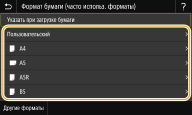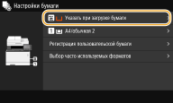 После регистрации параметра бумаги по умолчанию экран параметров бумаги не отображается при загрузки бумаги и всегда используется один и тот же параметр. Если загрузить другой размер или тип бумаги без изменения параметров бумаги, аппарат может не печатать надлежащим образом. Во избежание этой проблемы выберите <Указать при загрузке бумаги> на шаге 3, затем загрузите бумагу. |