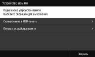 Если параметру <Экран при подкл. устр. пам.> задано значение <Включить>, то при подключении к аппарату запоминающего устройства USB, когда отображается экран Главный, отображаются доступные действия. <Экран при подкл. устр. пам.> ![]() Поскольку в спящем режиме экраны могут не отображаться, выйдите из него перед тем, как подключать запоминающее устройство USB. |