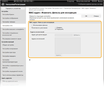 2 | Укажите адреса-исключения. Введите MAC-адрес в поле [Адрес для регистрации] и щелкните [Добавить]. Разделять адреса знаками тире или двоеточиями не требуется. ![]() Проверка на наличие ошибок ввода При неправильном вводе MAC-адресов доступ к аппарату из Удаленного ИП может быть невозможен. В этом случае необходимо указать для <Фильтр MAC-адресов> значение <Выкл.>. <Фильтр MAC-адресов> ![]() Если для фильтра исходящих выбрано значение [Отказать] Фильтрация исходящих многоадресных и широковещательных пакетов невозможна. Удаление MAC-адреса из списка исключений Выберите MAC-адрес и нажмите [Удалить]. ![]() | ||||