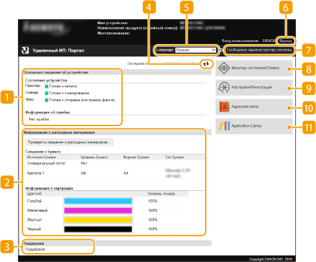 Отображение текущего состояния и информации об ошибках аппарата. Если возникает ошибка, отображается ссылка на страницу сведений об ошибке.