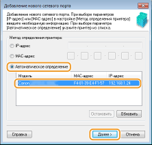 3 | Выберите [Автоматическое определение] и выберите найденный аппарат, затем нажмите [Далее]. ![]() ![]() Если не удается обнаружить аппарат Нажмите кнопку [Обновить]. Если проблему не удается устранить, выберите [IP-адрес] или [MAC-адрес], введите IP-адрес или MAC-адрес аппарата (Просмотр параметров сети), затем нажмите [Далее]. |