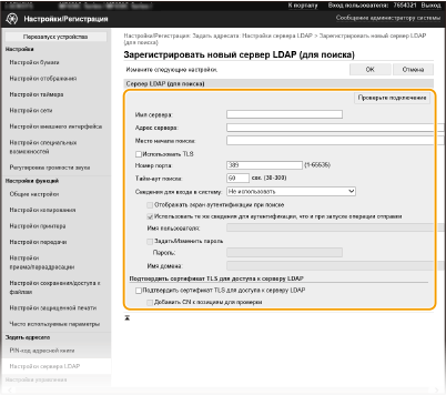 Регистрацию серверов LDAP необходимо выполнить раздельно либо для поиска, либо для аутентификации. Чтобы использовать сервер LDAP для поиска адресатов факсов или электронной почты, зарегистрируйте его для поиска; чтобы использовать сервер для аутентификации отправки электронной почты или факсов, зарегистрируйте его для аутентификации.
