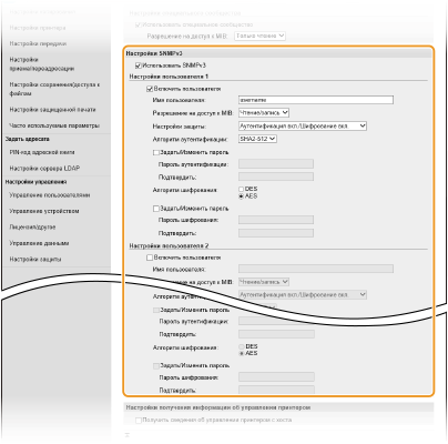 Простой протокол сетевого управления (SNMP) представляет собой протокол для мониторинга и контроля устройств связи в сети с помощью базы данных MIB. Аппарат поддерживает версию протокола SNMPv1 и версию с расширенными функциями безопасности SNMPv3. Статус аппарата можно проверить с помощью компьютера при печати документов или использовать для этого Удаленный ИП. Можно разрешить использование SNMPv1 или SNMPv3 по отдельности или одновременно. Укажите настройки для каждой версии в соответствии с особенностями сетевой среды и конкретными задачами.