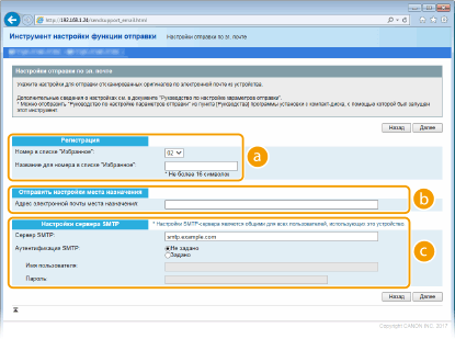 Программа Инструмент настройки функции отправки позволяет настраивать базовые параметры отправки электронной почты. Вместо программы Инструмент настройки функции отправки можно использовать Удаленный ИП для настройки более подробных параметров, таких как настройки проверки подлинности POP до отправки или настройки шифрованной связи. Настройка параметров связи электронной почты/интернет-факса |