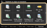Можете да добавите бутони за пряк път в екрана Начало за често използвани функции, като например <Копиране>, <Факс> и <Сканиране>. Можете например да извършвате задачи по-бързо и ефективно, като присвоите последователност от настройки (например "сканиране на двете страни на оригинал, записване като силно компресиран PDF файл и изпращане по имейл") към един-единствен бутон.