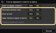 Задайте дали да се активира функцията за получаване в паметта само през определен времеви период от деня. Изберете <Вкл.> за активиране на функцията за получаване в паметта само през зададения в <Период на задържане в паметта> времеви период.