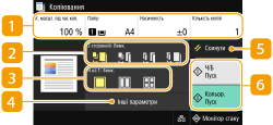 Відображається стан параметрів, наприклад коефіцієнт масштабування під час копіювання, папір для копіювання та кількість копій. Для правильного копіювання перевірте параметри, які тут відображаються. Щоб змінити параметр, виберіть його.