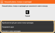 Якщо це повідомлення відображається для картриджа з чорним тонером, коли апарат приймає факс/інтернет-факс або налаштовано автоматичне виведення звіту, отримані факси/інтернет-факси та звіти буде збережено на апараті, щоб уникнути друку, унаслідок якого документи можуть виглядати тьмяними. Щоб продовжити друк документів, навіть коли тонера залишається дуже мало, виберіть для параметра <Продовж. др. в разі браку тон.> значення <Увімк.>. <Продовж. др. в разі браку тон.> |