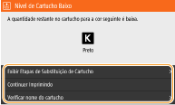 Se aparecer uma mensagem relativa ao cartucho de toner preto quando a máquina estiver a receber um fax/I-Fax ou se estiver definida a impressão automática de relatórios, os faxes/I-Faxes recebidos e os relatórios serão guardados na memória para não ficarem com um aspeto esbatido após a impressão. Para continuar a imprimir mesmo com pouca quantidade restante no cartucho de toner, defina <Continue Imp Qdo Cart Baixo> como <Ativado>. <Continue Imp Qdo Cart Baixo>