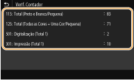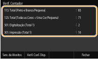 Pode verificar totais separados para o número de páginas utilizadas em impressões a cores e impressões a preto e branco. Esses totais incluem faxes, relatórios e listas, além de cópias e impressões de dados a partir de computadores.