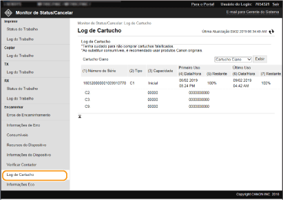 Pode verificar os registos de utilização das cartridges de toner e outros registos. É possível mudar a visualização para cada cor de cartridge de toner.