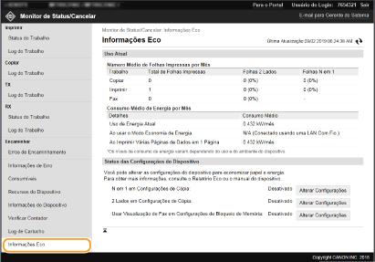 É apresentado o volume total mensal de impressões e o consumo total mensal de energia. Pode apresentar o ecrã de informações ecológicas e alterar as definições para reduzir o consumo de papel e energia.