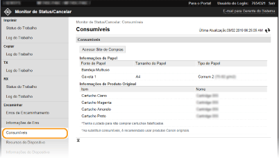 É apresentada a informação de tamanho e tipo de papel para a origem do papel, número de modelo do cartucho de toner, etc. Também pode clicar em [Verificar Detalhes de Consumíveis] na página do portal (página principal) para aceder a esta página (