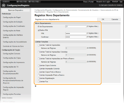 Registe uma ID de departamento e defina um PIN para a ID. Registe todas as ID de departamento destinadas a gestão.